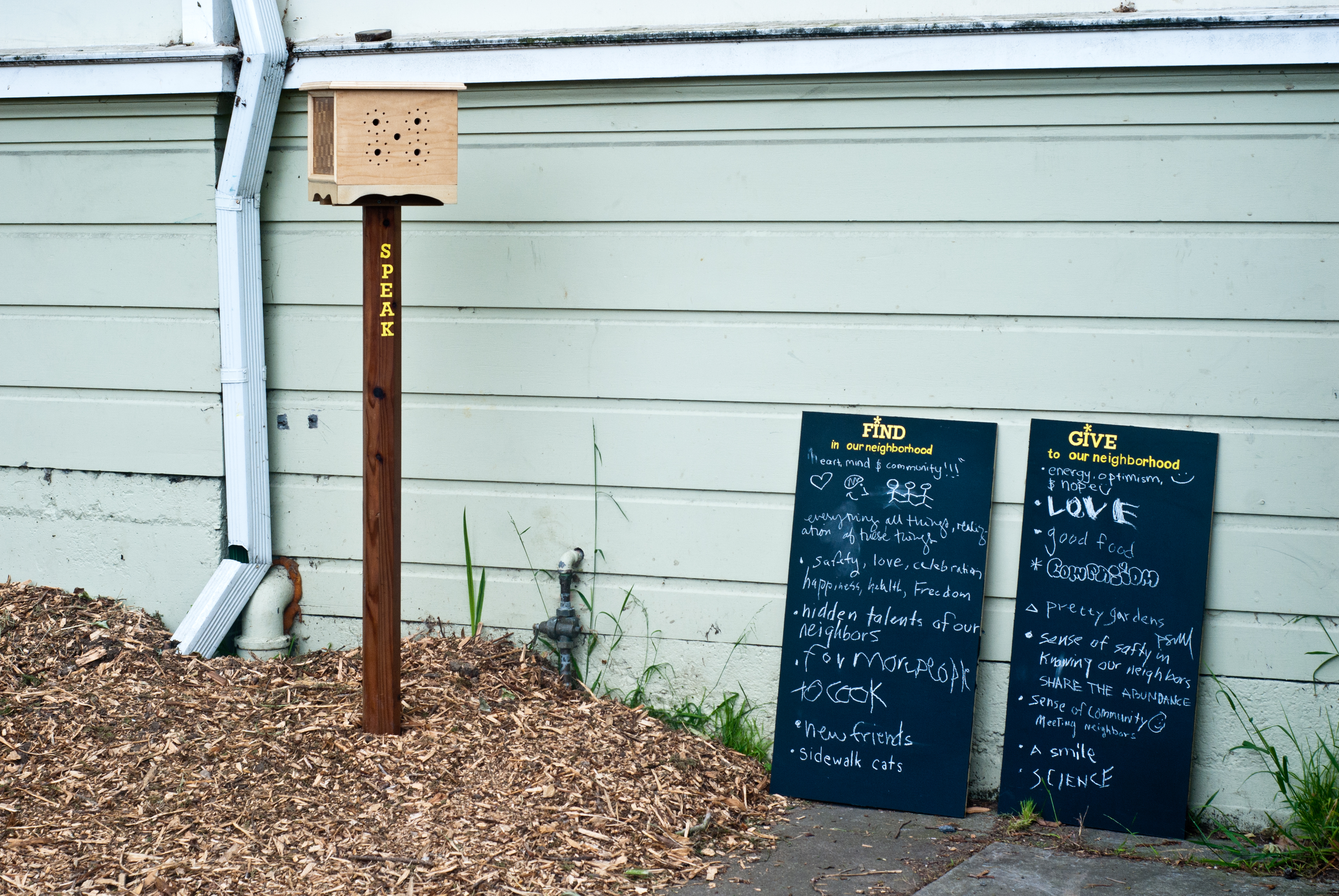The speaker box was designed for attendees to talk about what they wanted to see in the neighborhood. The boards invited neighbors to write what they wanted to give and find in the neighborhood.
